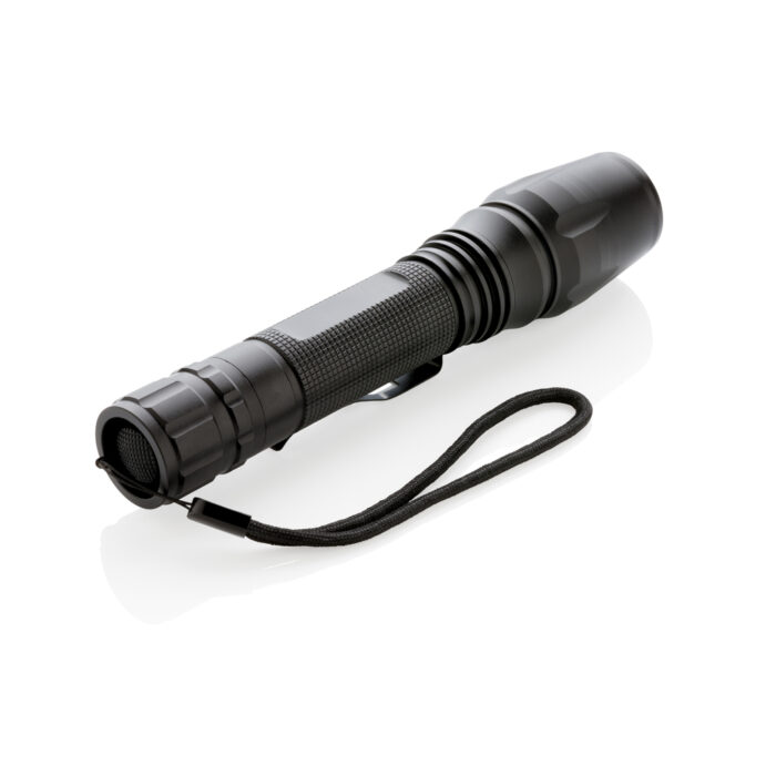 Super bright and tough 10W CREE led torch that can handle even the most difficult conditions. The durable aluminium torch is IPX 4 waterproof and shockproof up to 1 metre drop. The beam of the torch can be adjusted to focus or to light up a bigger area. With belt clip for carrying the torch. 250 lumen and working time of 6 hours. Includes batteries for direct use.