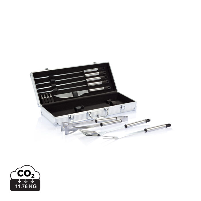 12 pcs stainless steel barbecue set, including 4 pcs skewers, carving knife, 4 corn holders, spatula, carving fork with protection cover and pair of tongs. Packed in aluminium case with hinges and handle.