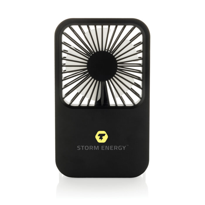 The Aervina desk fan, made from RCS certified recycled plastic, is a sleek and practical way to enjoy a refreshing breeze at home or in the office. Its modern black design combines style with function. The rechargeable 1200 mAh Li-ion battery provides up to 3 hours of working time and recharging in 4 hours via the included 120 cm black TPE USB-A to USB-C cable. With three adjustable speed levels and an adjustable stand, the Aervina fan offers flexible comfort wherever you need it. Made from RCS certified recycled ABS plastic. RCS (Recycled Claim Standard) is a standard to verify the recycled content of a product throughout the whole supply chain. Total recycled content: 58 % based on total item weight. This fan is PVC-free and packaged in an FSC® certified kraft box.Max. power: 5W | Input current: 5V / 400mA.