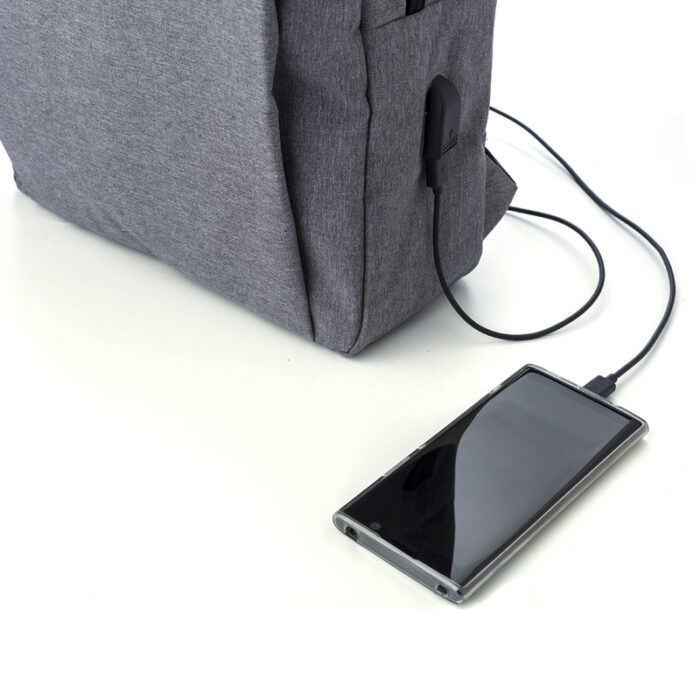 Backpack, main compartment and front pocket zipped, adjustable soft shoulder straps, USB connection (power-bank not included)
