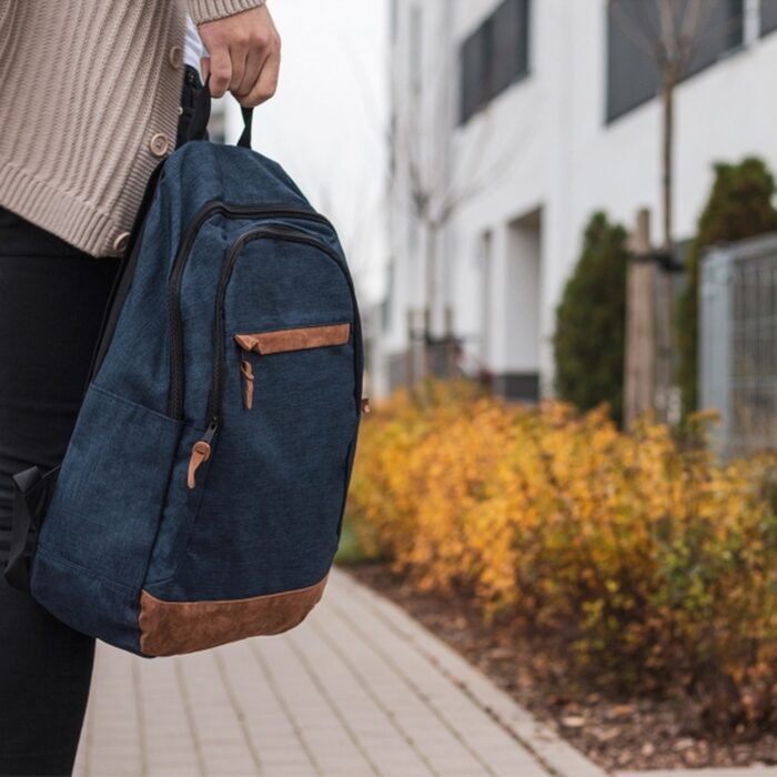 600D polyester backpack with suede-look contrasting bottom and closing strip, with hanging loop, shoulder straps, and front compartment. We will print your logo on the backpack.