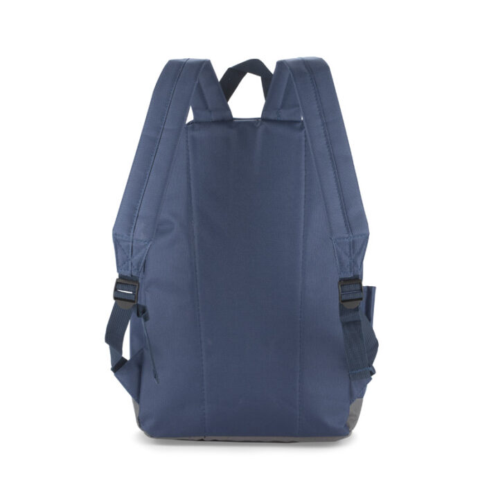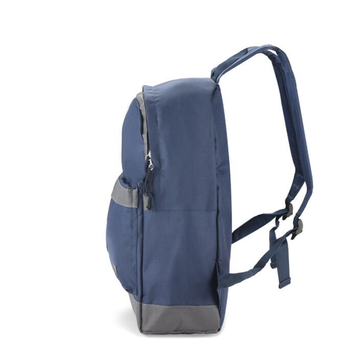 The ENVI backpack is made of 600D RPET polyester, which makes it more environmentally friendly. It has one main compartment fastened with two zippers. The bottom of the backpack and the back are slightly stiffened. At the front there is a large zippered pocket that will fit the necessary small items. On the side there is an open pocket that holds a small water bottle.