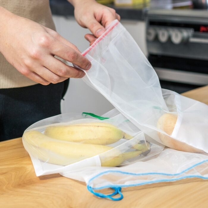 Environmentally friendly, washable and durable fresh net made from recycled PET material. Contribute to plastic waste reduction and use this practical net for the purchase of fruits and vegetables. Your advertisement will be placed on the label.