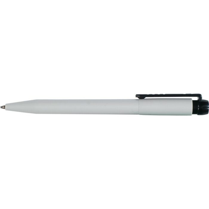 Ball pen Stilolinea, a white barrel, colored wide clip, writes in blue, provided with German Dokumental Ink, product made from ABS, plastic, nickel, metal