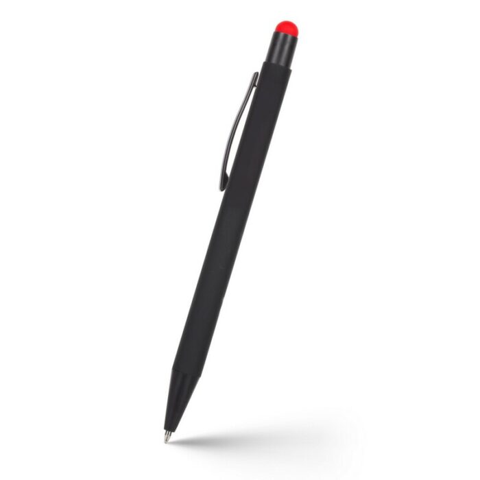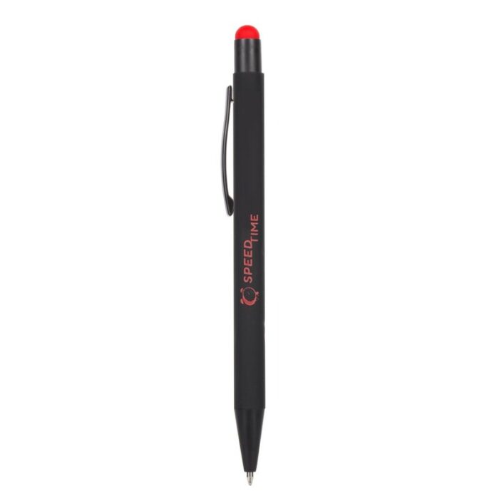 Ball pen with black barrel, features a rubber finish, coloured stylus tip enables touch screen operation, the engraved surface colour can be white or similar to the stylus tip, writes in blue, product made from aluminium