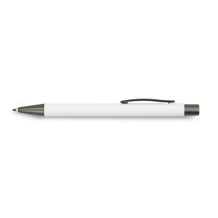 Ball pen with coloured barrel, features trim parts in grey colour, features a rubber finish, writes in blue, product made from aluminium, plastic and metal