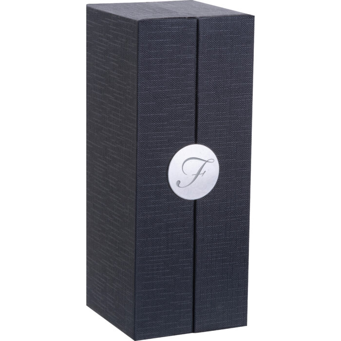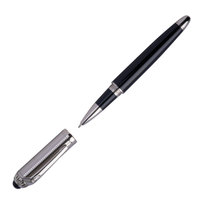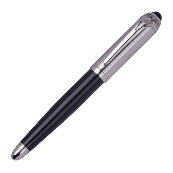 Blue-writing Ferraghini rollerball pen made of stainless steel, featuring the distinctive “F” on the clip top and a writing length of up to 400 m. Packaged in a high-quality box matching the pen.