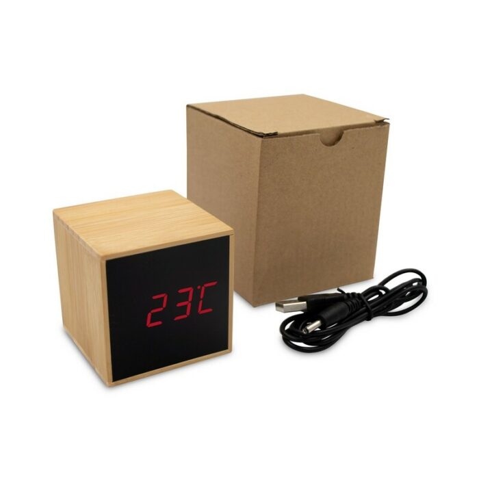 Bamboo desk clock, LCD display, powered by cable (included) 5V 500 mA, alternative power source for several hours of use: 3 AAA batteries (not included), CR2032 battery to maintain settings when disconnected from the power supply (included), functions: time, date, temperature, alarm (possibility to set 3 alarms for 3 different hours)