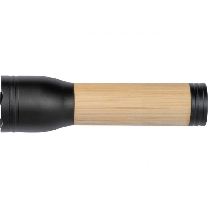 Rechargeable torch made from recycled aluminium with bamboo handle with 400 lumen brightness and a battery capacity of 300 mAh. Type C charging cable included.