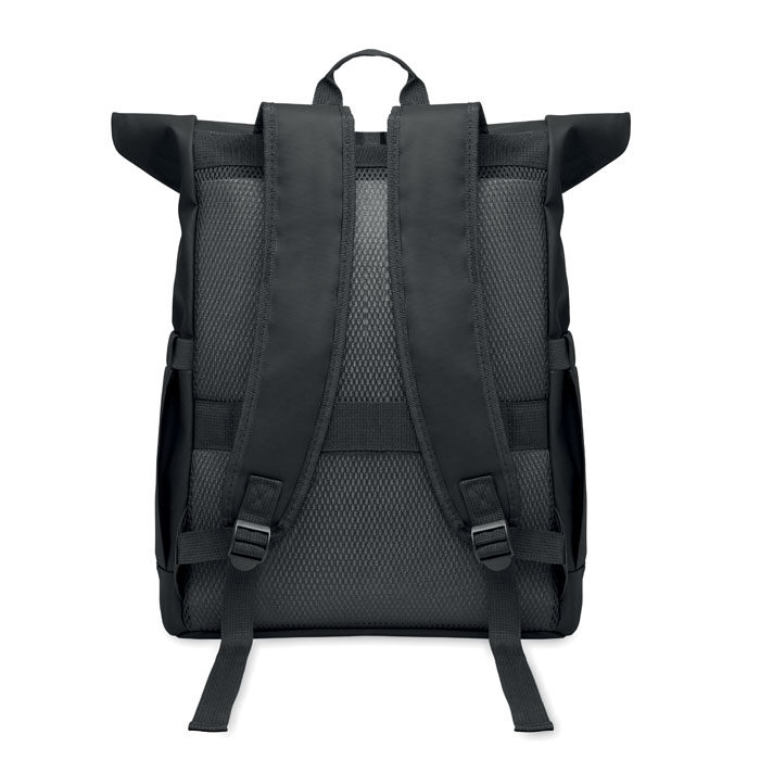 Roll top 15 inch laptop backpack in PU coated 600D RPET polyester and RPET polyester lining. Meshed padded back with zippered pocket and trolley strap. Padded shoulder strap with mesh inside finishing.