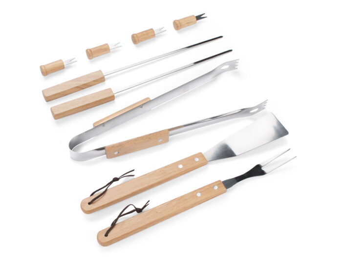 PANO is a 9-piece grill set in a practical zipped case, with an adjustable strap for comfortable carrying. The set is composed of a food turner, fork, tongs, skewers (2 pcs.) and corn holders (4 pcs.). The holders of all parts are made of wood.
