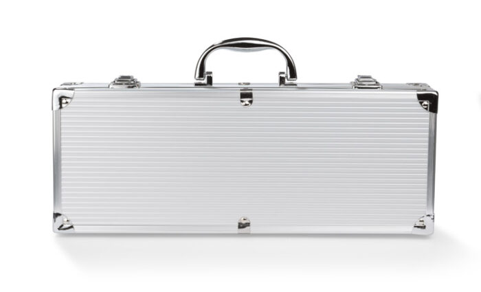 Barbecue set in a case: tongs, spatula, knife, fork and brush. The plate is attached separately.