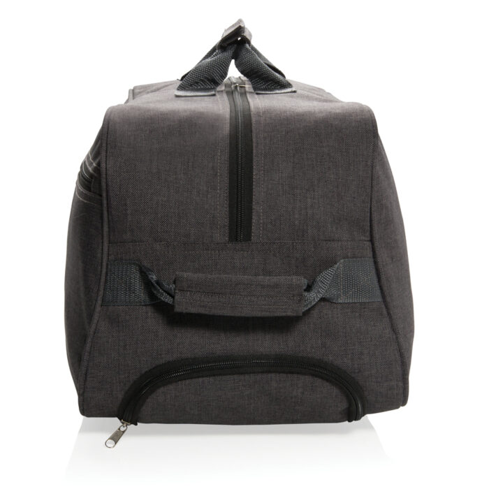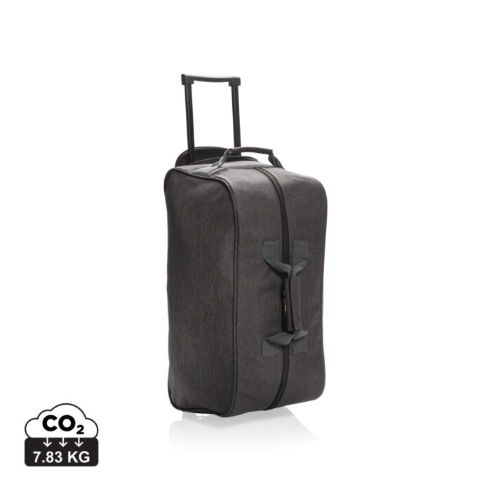 600D high density extra strong two tone polyester fabric. With extendable trolley system. One front pocket and one zipper closure main compartment.