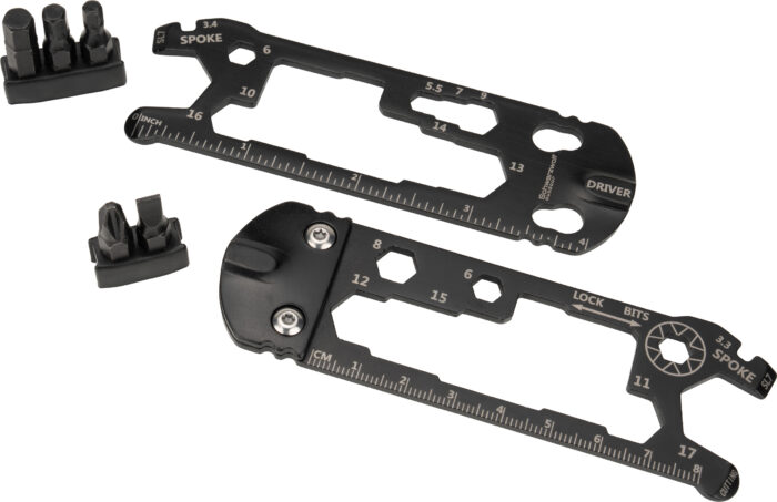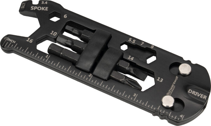Multifunctional Schwarzwolf tool for bikers. Includes 7 types of tool in different sizes – bicycle spoke key, flat screwdriver, phillips screwdriver, hex key 4/5/6mm, hex wrench in a size from 3,3 to 18 mm, bottle opener and ruler.