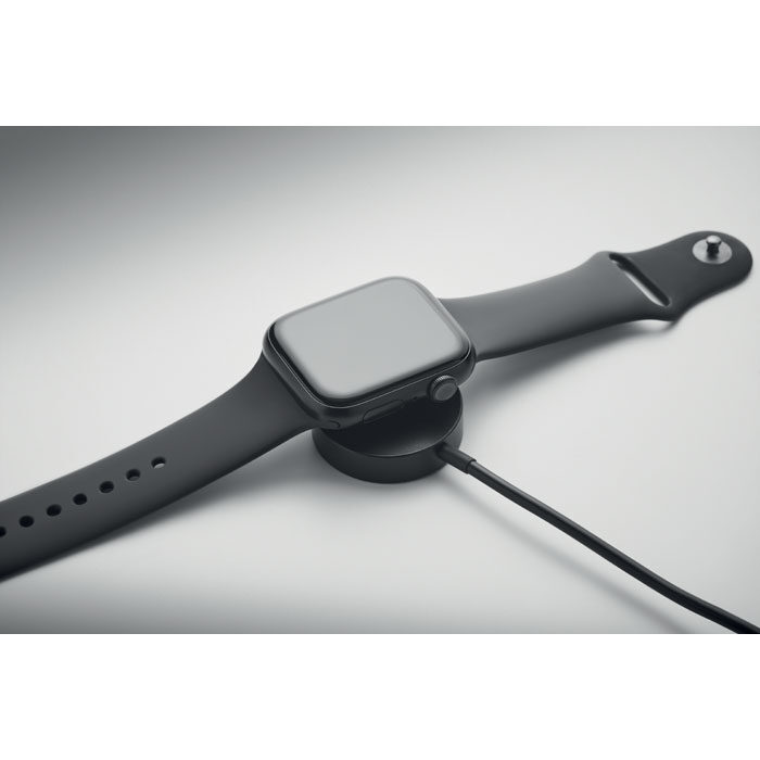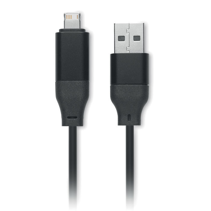 Key ring 4 in 1 data transfer and charging cable 60W with bamboo detail. Input: 2-in-1 Type-C <(>&<)> Type-A. Output: Watch charging (Samsung® and Apple®) , type-C and micro-B (2 in 1 pin).