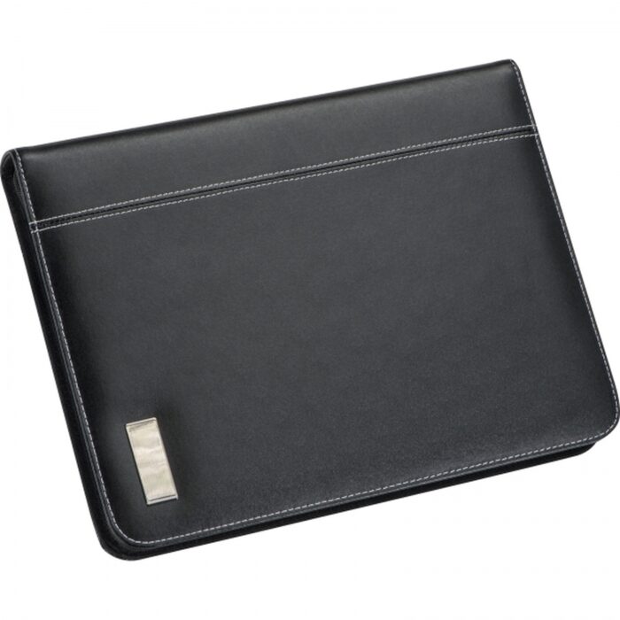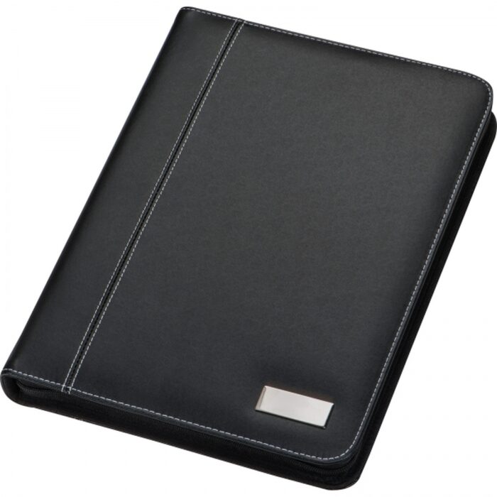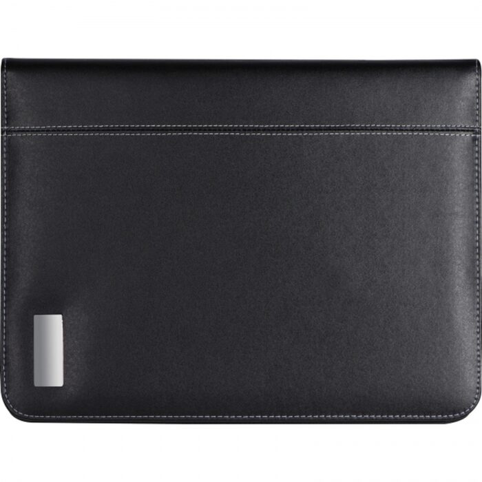 A4 folder made of high-quality leather imitation with business card slots, pen loop, smartphone holder and stand, and lined block with a small calendar impression. We will engrave your logo on the outer metal plate.