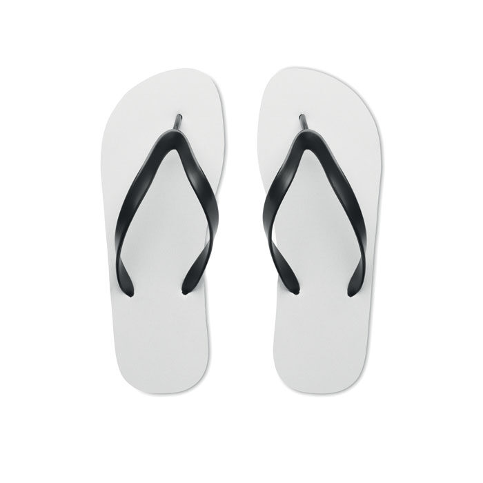Sublimation beach slippers with PVC straps. Sole made of rubber with polyester top cloth. Size 42-44. Item can only be ordered printed.