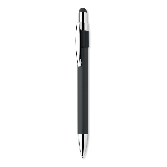Stylus push ball spinner pen in recycled aluminium. Blue ink.