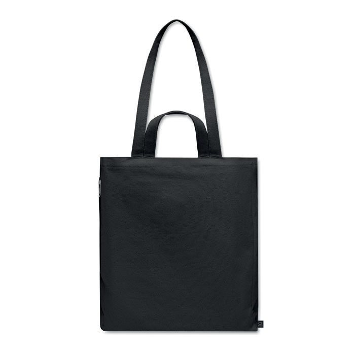Recycled polycotton shopping or beach bag (70% recycled cotton, 30% recycled polyester) with short and long handles. It has a side zippered pocket. 380 gr/m².