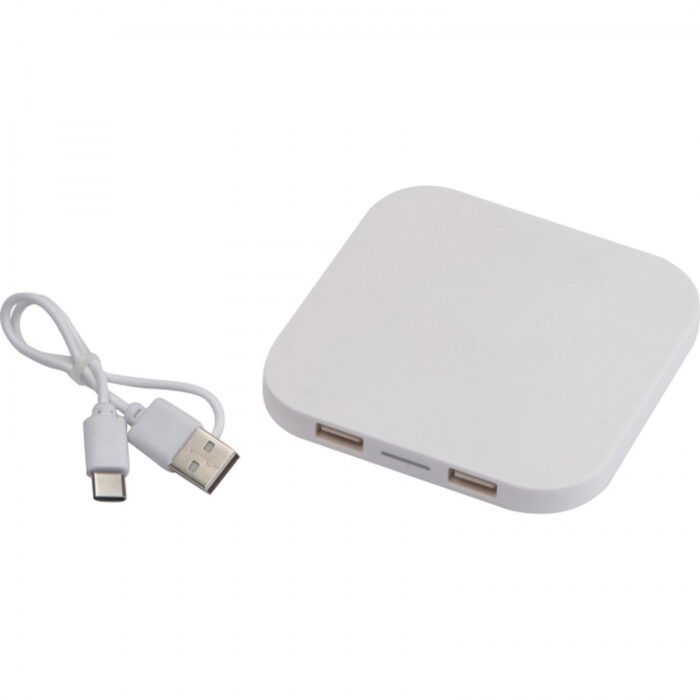 Plastic wireless charger with 2 USB ports, charging cable included. Charges all QI enabled smartphones.
