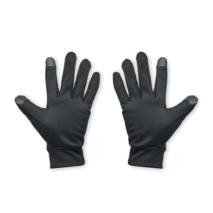 Tactile sport gloves for smartphone in polyester. Two fingers with touch function with anti-slip dots on palm and finger in PVC.