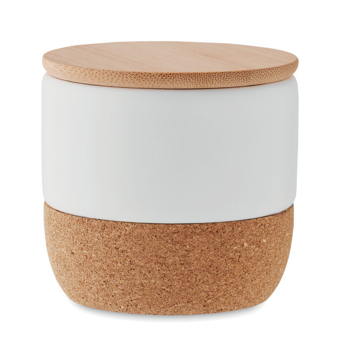 Fresh linen fragranced plant based wax candle in stoneware jar holder with bamboo lid and cork base. 80 gr. Burn time: 7.5 hours. Bamboo is a natural product, there may be slight variations in colour and size per item, which can affect the final decoration outcome.