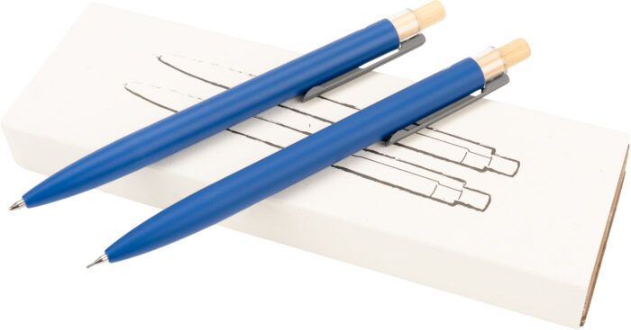Writing set consisting of a pen with blue-writing semi-gel refill and a mechanical pencil made of recycled aluminium, with metal clip and bamboo pusher in an environmentally friendly box.