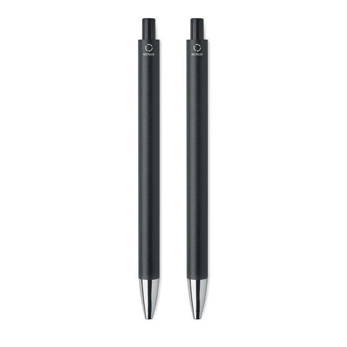 Recycled aluminium pen set with 1 push button ball pen and 1 graphite inkless pen. Blue ink. Presented in recycled paper box.