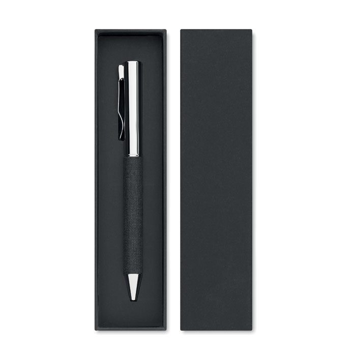 Metal twist ball pen with RPET polyester detail presented in gift box. Blue ink.