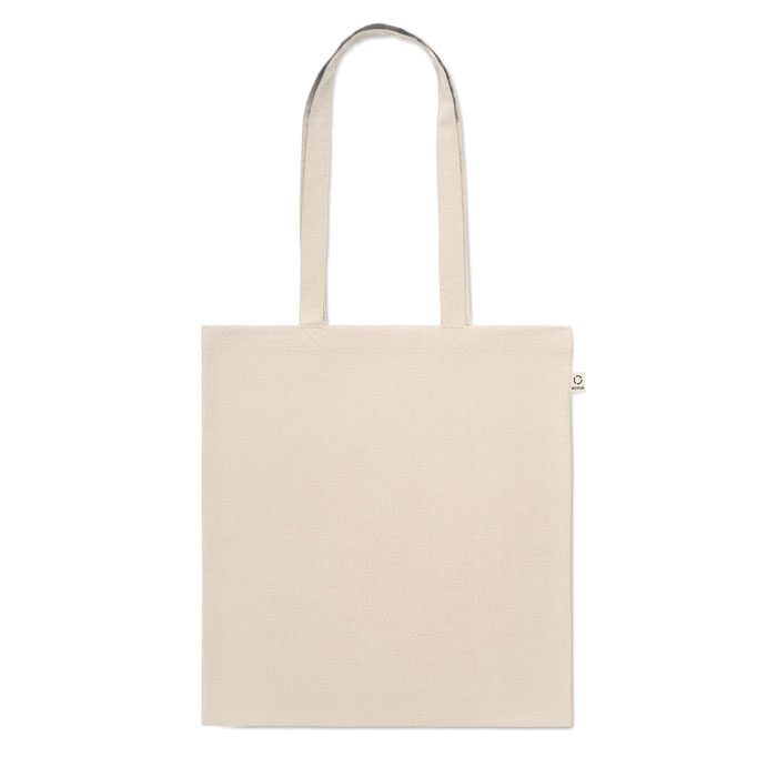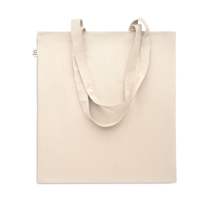 Recycled pre-consumer cotton shopping bag (70% recycled cotton and 30% RPET) with long handles. 140 gr/m². This item can shrink after printing.