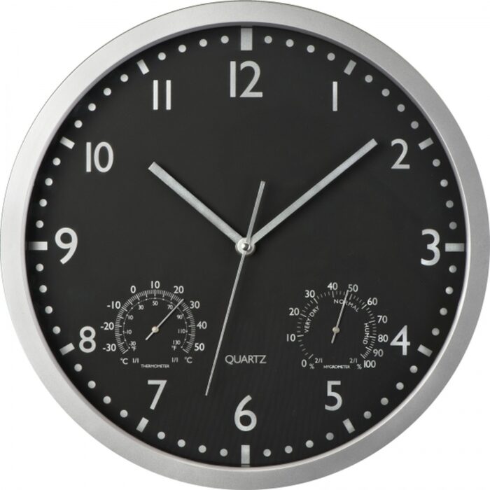 Classical wall clock with hygro and thermometer. By means of a bayonet catch the display can easily be taken out of the housing and the clock can easily be printed.