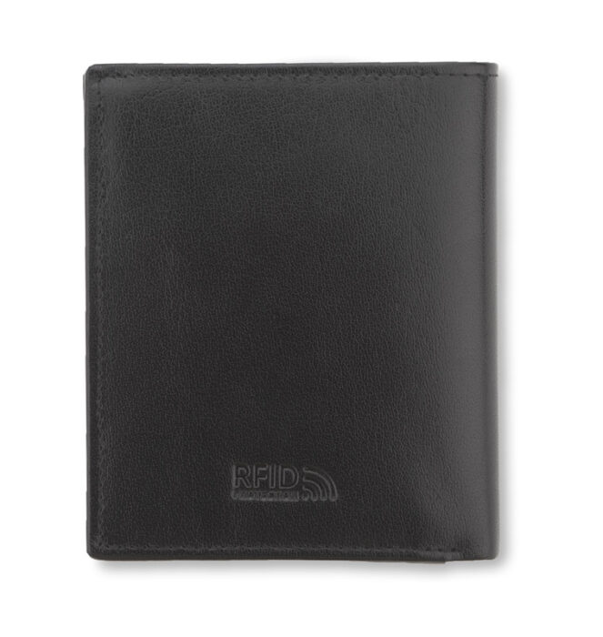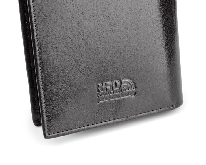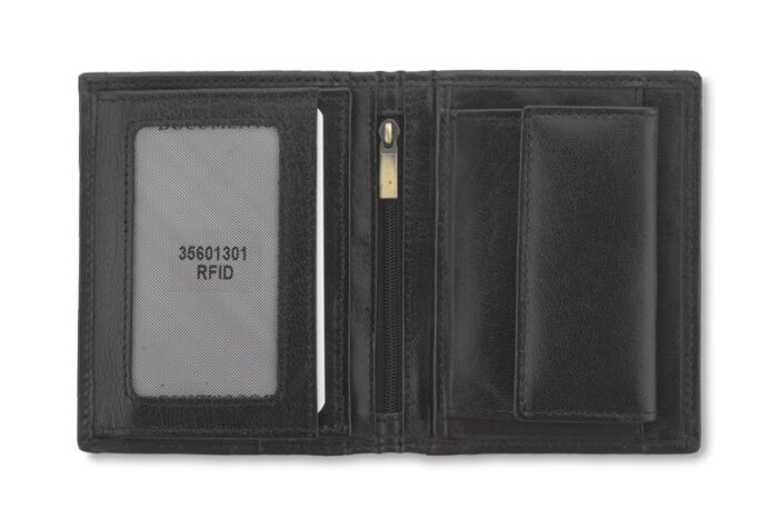 Leather wallet containing a pocket for coins, 2 pockets for notes, 4 holes for credit cards and 5 pockets for the documents and one zipped pocket. The wallet is packed individually in a wooden box. Additionally the wallet has a protective film blocking RFID signal, which prevents from stealing data from credit cards.