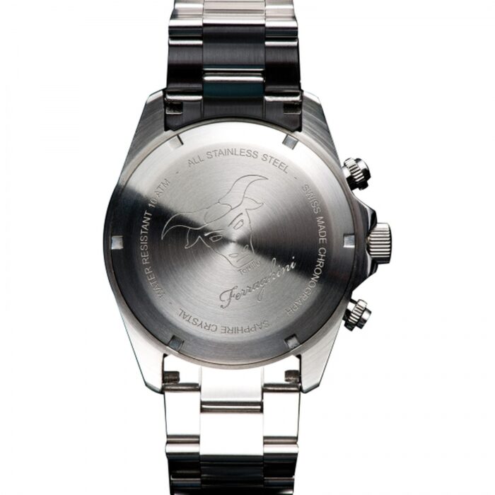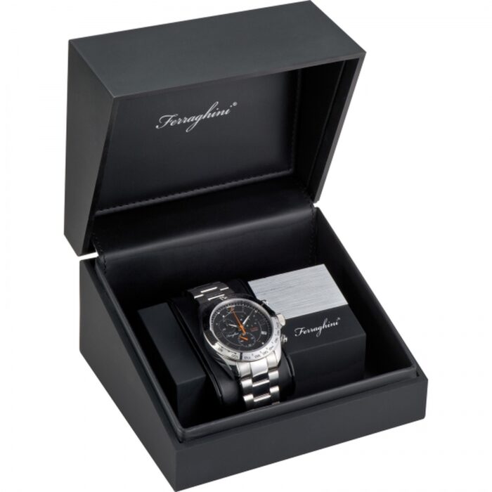 TORELLO – classic, sportive design paired with Swiss precision. This Swiss chronograph with large housing (42mm width) has all features for sporty people: second hand, stop watch, date, speedometer, saphire glass, 100 meters waterproof (10 ATM), hypoallergenic stainless steel housing, stainless steel wristband and flap closure.