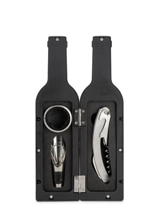 The SOMMELIER wine set in a bottle-shaped case is a practical and stylish promotional gift. It contains the necessary accessories: a waiter’s knife, a pouring bottle and a rim to prevent dripping. The compact form makes it easy to store and gives the set an original character. Perfect as a gift for customers, business partners or as an addition to a wine gift set.