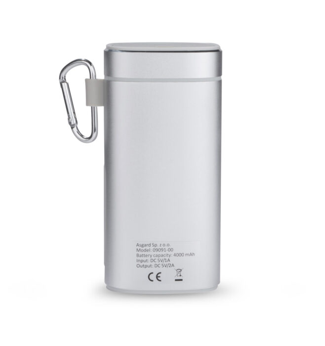 Elegant wireless speaker with 4000 mAh power bank is a great gift for gadget lovers. It is made of metal which makes it durable and an engraved logo will look good on it. The speaker can be used as a hands-free set. Music can be played via Bluetooth (Version 4.2), audio cable with 3.5mm jack (not included) or micro SD card. In addition, it offers IPX4 waterproof class, i.e. total protection against sprinkling and splashing with water from various directions with intensity up to 10 litres per minute. It is ideal for tourists and in every day use e.g. under light rain. The product complies with relevant European Union Directives, has a CE marking and a 1-year guarantee. Micro USB charging cable and carabiner included. Technical specifications: – input: 5V/1A, – output: 5V/2A, – lithium-polymer battery, output power: 5W x 1, 3D stereo effect and bass boost, Voltage: 5V S/N ratio: ≥ 80 dB, working time: 10-15 hours