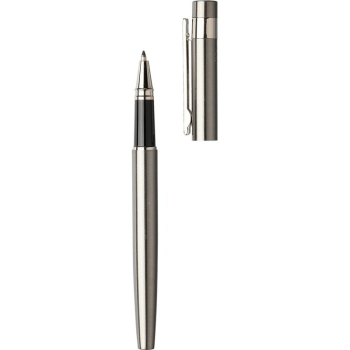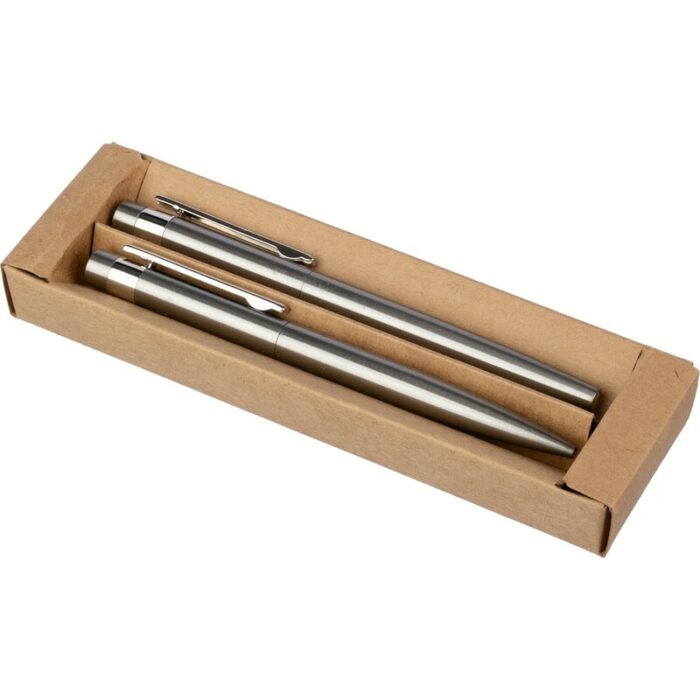 Writing set including a twist pen and rollerball pen, both pens write in blue, includes recycled steel icon on products, set packed in a craft paper box, products made from recycled stainless steel