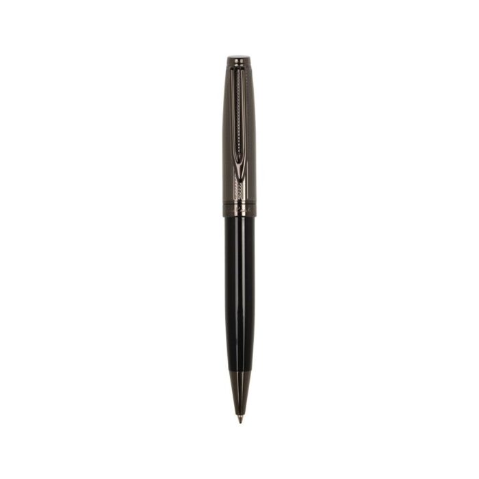 Luxury Pierre Cardin writing set with an elegant design, including a ballpoint pen and a fountain pen. The bodies of both instruments are made in glossy black with the upper parts in a gunmetal shade. The ballpoint pen features a rotating mechanism and a high-quality blue refill with a 1 mm tip, while the fountain pen is equipped with a standard blue ink cartridge, ensuring smooth and precise writing. The set comes packed in an elegant gift box with a certificate of authenticity.