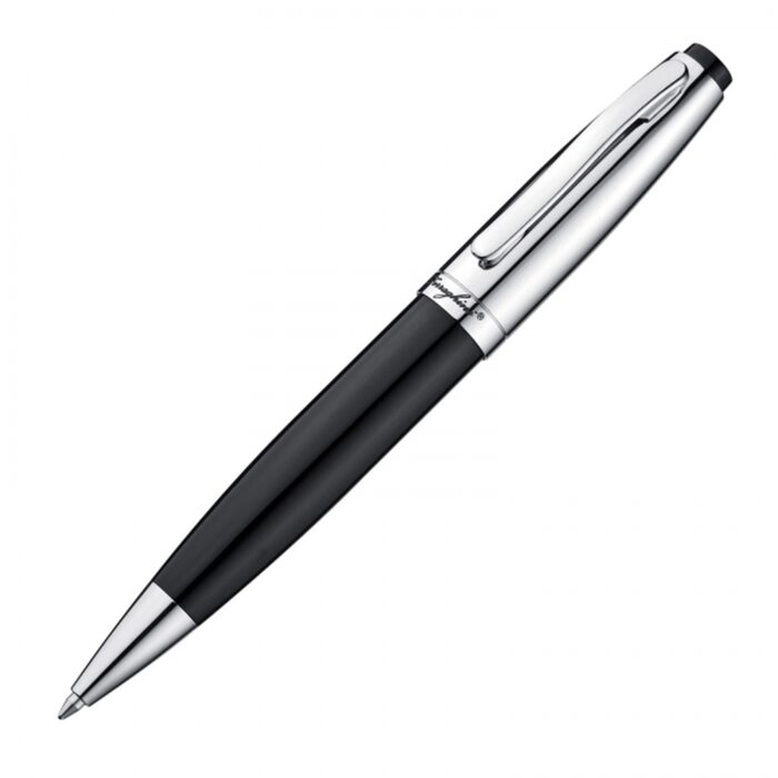 Classically elegant Ferraghini writing set consisting of a ball pen with twist mechanism and a rollerball pen (both blue-writing) in a black folding box*.