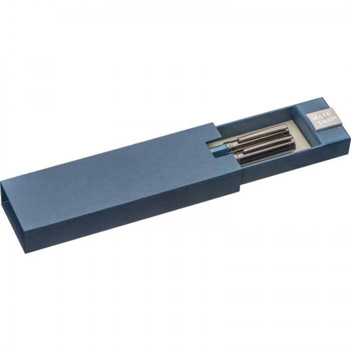Mark Twain writing set consisting of a rollerball and pen made of metal with a dark blue finish (writing colour blue).