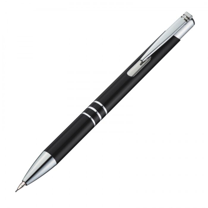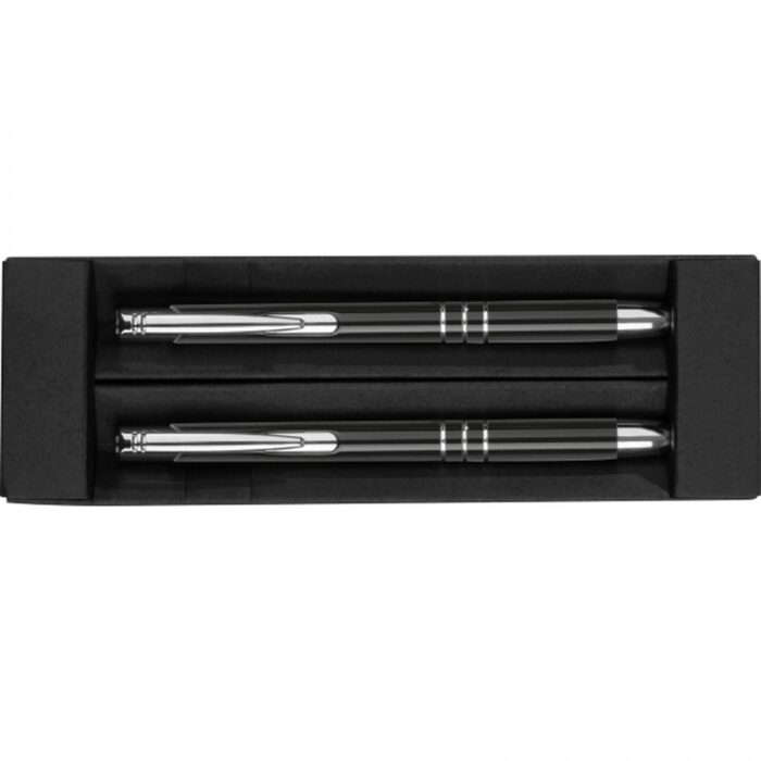 Metal pen & pencil set in a black paper box. The pen comes with a blue writing big refill.